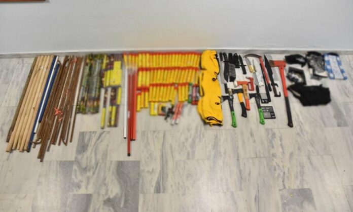 Στο γειτονικό κτίσμα εντοπίστηκαν τα τσεκούρια, κτλ ενώ στον χώρο του συνδέσμου βρέθηκαν κασκόλ και άλλα αντικείμενα με διακριτικά των ομάδων του ΠΑΟΚ και του Ηρακλή καθώς και κιτρινόμαυρα fullface.