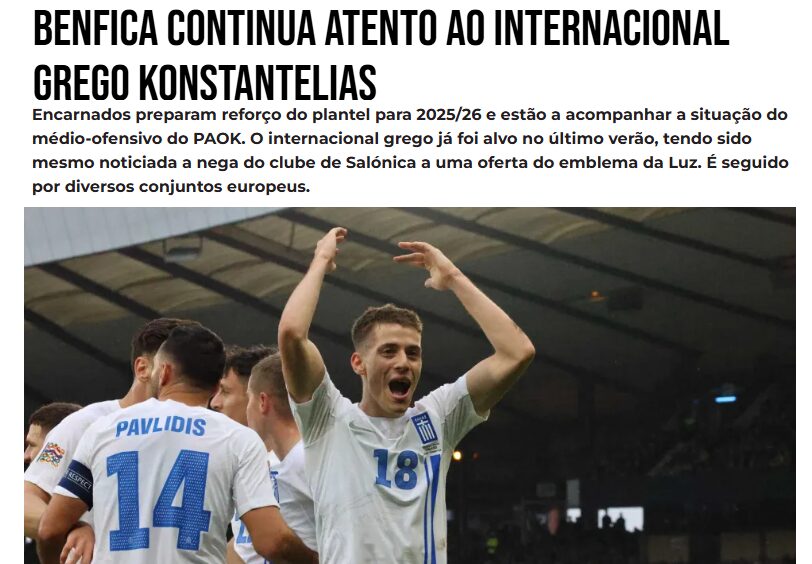 Έτσι, η Μπενφίκα επανέρχεται στη διεκδίκηση του Γιάννη Κωνσταντέλια, σύμφωνα με δημοσίευμα της πορτογαλικής αθλητική εφημερίδας O Jogo. Η συγκεκριμένη είδηση είναι στο πρωτοσέλιδο της εφημερίδας, με τον χαρακτηριστικό τίτλο «οι αετοί επιστρέφουν για τον Κωνσταντέλια».