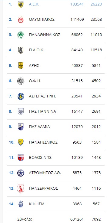 Είναι χαρακτηριστικό πως η ΑΕΚ έχει κόψει ως τώρα στους εντός έδρας αγώνες της 183.541 εισιτήρια, ενώ ακολουθεί ο Ολυμπιακός με 141.409 εισιτήρια, ο Παναθηναϊκός με 66.062 εισιτήρια, ο ΠΑΟΚ με 84.140 εισιτήρια και έπειτα ο Άρης με 40.887 εισιτήρια. Εννοείται πρώτη είναι η ΑΕΚ και στο μέσο όρο των εισιτηρίων της.