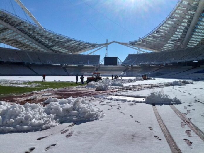 Με εντατικό ρυθμό συνεχίζονται από το πρωί οι εργασίες για να καθαριστεί το ΟΑΚΑ από το χιόνι εν όψει του αγώνα της ΑΕΚ με τον ΝΠΣ Βόλο, μεθαύριο Κυριακή.