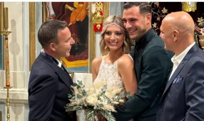 Κουμπάροι του ζευγαριού, που αντάλλαξε όρκους αιώνιας πίστης και αγάπης, ήταν οι καλοί τους φίλοι, Γιάννης Κονσούλας και Αναστάσιος Ντούγκας. Η τελετή είχε έντονο ποδοσφαιρικό χρώμα, αλλά και άρωμα … Survivor.