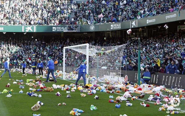 Κατά τη διάρκεια του ημιχρόνου στον αγώνα της ομάδας με την Ειμπάρ το Σάββατο, οι φίλοι της Μπέτις πέταξαν δεκάδες αρκουδάκια, προκειμένου να μοιραστούν σε οικογένειες με οικονομικά προβλήματα.