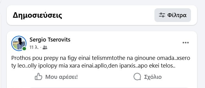 Στην ανάρτησή του, ο Σέρτζιαν Τσέροβιτς αναφέρει τα εξής: “Πρώτος που πρέπει να φύγει είναι ο Τέλης. Μόνο τότε θα γίνουμε ομάδα. Ξέρω τι λέω. Όλοι οι υπόλοιποι μια χαρά είναι. Απλό… δεν υπάρχεις. Από εκεί τέλος…”.