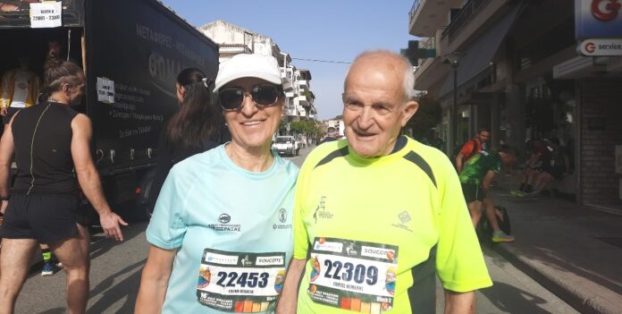 Στη φωτογραφία, με τον απίστευτο Γιώργο Θέμελη (1936) που σε ηλικία 89 ετών, τερμάτισε για μία ακόμη φορά τον Ημιμαραθώνιο, σε 3:16:52. Βλέπουμε τους δύο δρομείς, πριν την εκκίνηση στην Καλαμπάκα!
