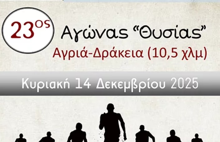 Ο 23ος Αγώνας Θυσίας Αγριά-Δράκεια θα γίνει την ερχόμενη Κυριακή (14/12) ώρα 10.00 το πρωί. Ο αγώνας είναι απόστασης 10,2 χιλιομέτρων (ανηφορικός) και είναι αφιερωμένος στη μνήμη των 115 θυμάτων που εκτελέστηκαν τα ξημερώματα της 18ης Δεκεμβρίου 1943 από τα Γερμανικά Στρατεύματα Κατοχής.
