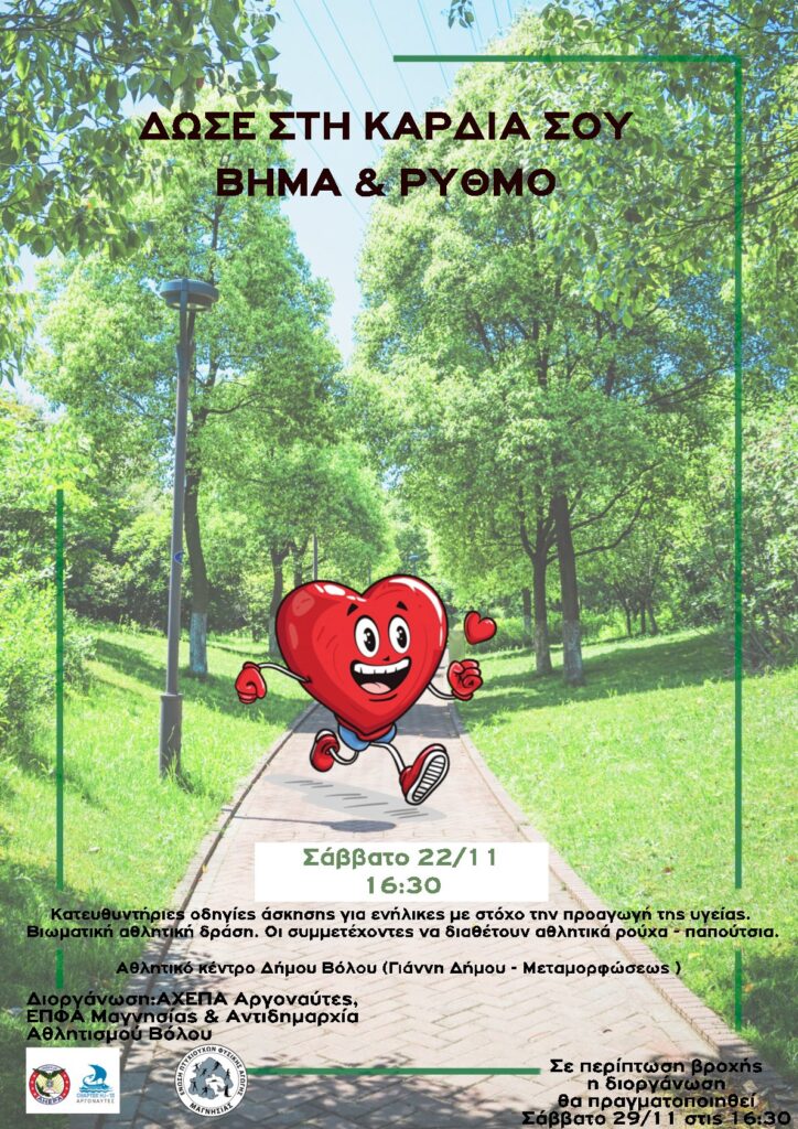 Το Σάββατο 22/11/2025 και ώρα 16:30, η Ένωση Πτυχιούχων Φυσικής Αγωγής Μαγνησίας (Ε.Π.Φ.Α.) συνδιοργανώνει με τους ΑΧΕΠΑ-Αργοναύτες, βιωματική δράση με θέμα « Δώσε στην καρδιά σου βήμα και ρυθμό», στον υπαίθριο χώρο του Αθλητικού Κέντρου του Ασύλου (Γ. Δήμου – Μεταμορφώσεως), μια δράση με στόχο την προαγωγή της υγείας μέσω κατευθυντήριων οδηγιών άσκησης για ενήλικες. Οι συμμετέχοντες θα πρέπει να έχουν μαζί τους αθλητικά ρούχα και παπούτσια.