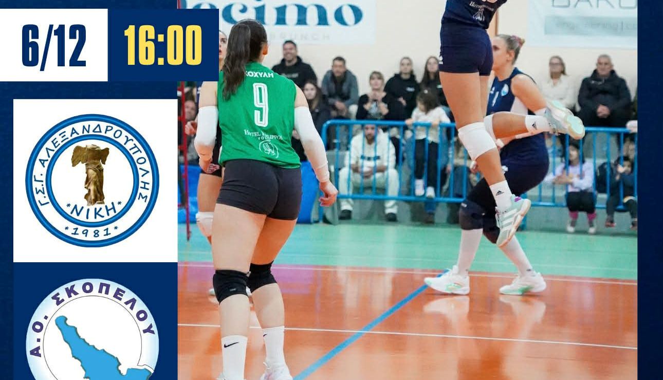 Για τη β’ ζώνη της Α2 βόλεϊ Γυναικών και στο πλαίσιο της 8ης αγωνιστικής ο Α.Ο. Σκοπέλου ταξίδεψε για δεύτερη φορά στην Αλεξανδρούπολη, για να αντιμετωπίσει αυτή τη φορά τη Νίκη σήμερα Σάββατο (6/12) στις 16.00. To ματς θα μεταδοθεί μέσα από το κανάλι της Νίκης Αλεξανδρούπολη στο you tube.