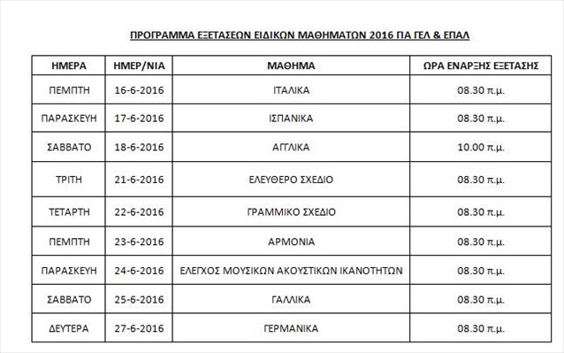 ΠΡΟΓΡΑΜΜΑ ΕΞΕΤΑΣΕΩΝ ΕΙΔΙΚΩΝ ΜΑΘΗΜΑΤΩΝ 2016 ΓΙΑ ΓΕΛ & ΕΠΑΛ