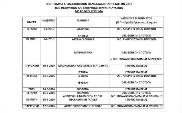 Πρόγραμμα επαναληπτικών πανελλαδικών εξετάσεων 2016 των ημερήσιων και εσπερινών Γενικών Λυκείων με το νέο σύστημα