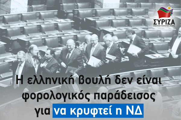 «Η ελληνική Βουλή δεν είναι φορολογικός παράδεισος για να κρυφτεί η Ν.Δ.» αναφέρει στο σχόλιό του ο ΣΥΡΙΖΑ.