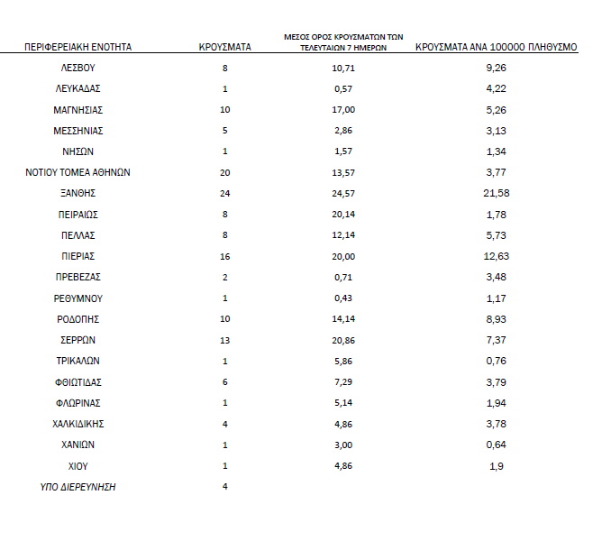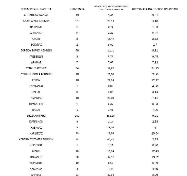 Η κατανομή των 573 νέων εγχώριων κρουσμάτων ανά Περιφερειακή Ενότητα παρουσιάζεται στον κατωτέρω πίνακα.