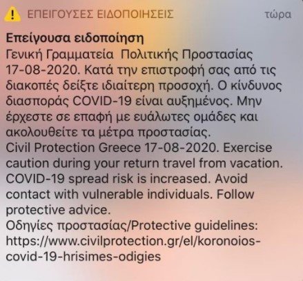 Γενικευμένο μήνυμα μέσω του 112 έστειλε η Πολιτική Προστασία, στο πλαίσιο του περιορισμού της διασποράς του κορωνοϊού. Λίγο πριν τις 13:30 πολλά κινητά χτύπησαν και παρέλαβαν το μήνυμα που προειδοποιεί «μην έρχεστε σε επαφή με ευάλωτες ομάδες». Παράλληλα τονίζει σε όσους επιστρέφουν από τις διακοπές τους, όπου ουσιαστικά εντοπίζεται και το μεγάλο πρόβλημα έξαρσης του ιού στη χώρα μας, ότι «ο κίνδυνος διασποράς COVID-19 είναι αυξημένος» ενώ καλεί τους πολίτες να ακολουθούν τα μέτρα προστασίας.