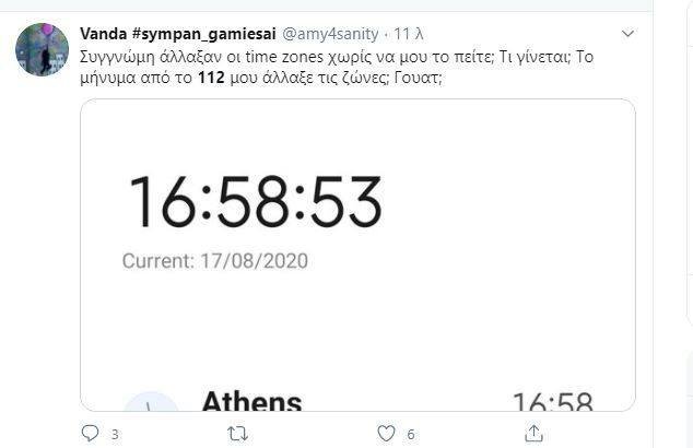 Είναι χαρακτηριστικό το σχόλιο που έκανε στο Twitter χρήστης, γράφοντας συγκεκριμένα: «Συγγνώμη, άλλαξαν οι time zones χωρίς να μου το πείτε; Τι γίνεται; Το μήνυμα από το 112 μου άλλαξε τις ζώνες; Γουάτ;».