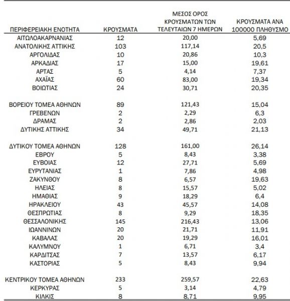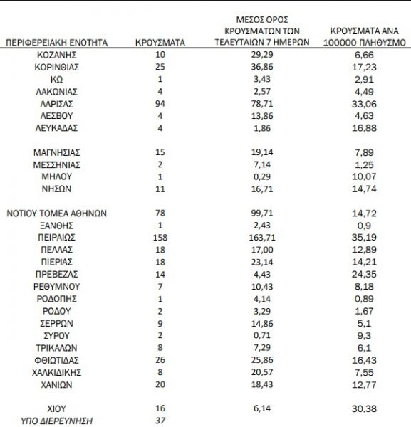 Ανησυχία προκαλούν οι 60 μολύνσεις που «δίνει» η Αχαΐα, οι 26 της Φθιώτιδας και οι 25 της Κορινθίας. Στη Μαγνησία ο ΕΟΔΥ δίνει 15 νέα κρούσματα.