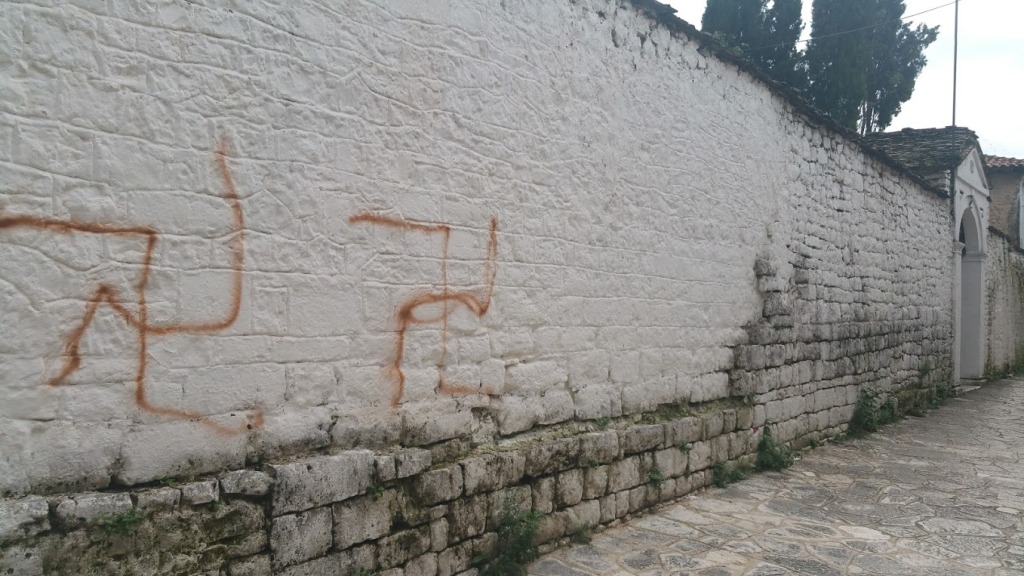 Όπως έγινε γνωστό, άγνωστοι έφτιαξαν με σπρέι αγκυλωτούς σταυρούς στους τοίχους της εβραϊκής συναγωγής και σε παρακείμενα σπίτια.