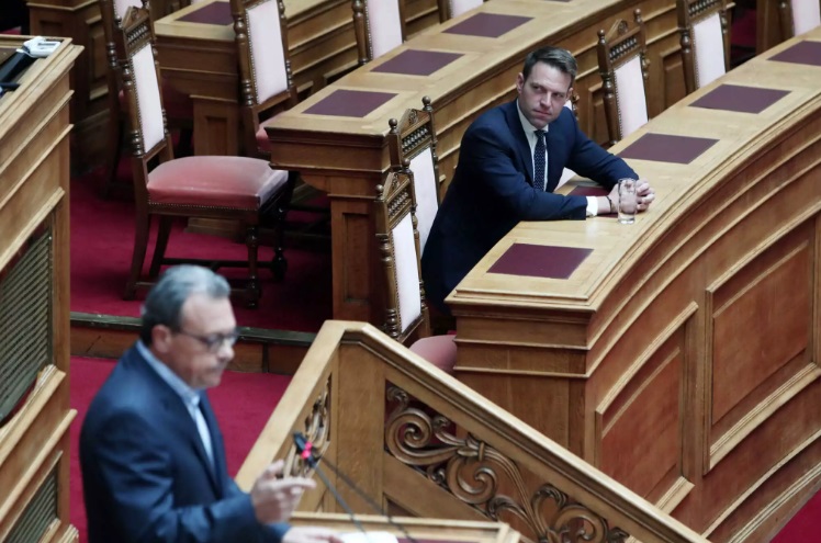 Πρώτη εμφάνιση του προέδρου του ΣΥΡΙΖΑ Στέφανου Κασσελάκη στην Ολομέλεια της Βουλής από τα δεξιά έδρανα των αξιωματούχων για να παρακολουθήσει την ομιλία του προέδρου της ΚΟ του ΣΥΡΙΖΑ Σωκράτη Φάμελλου.