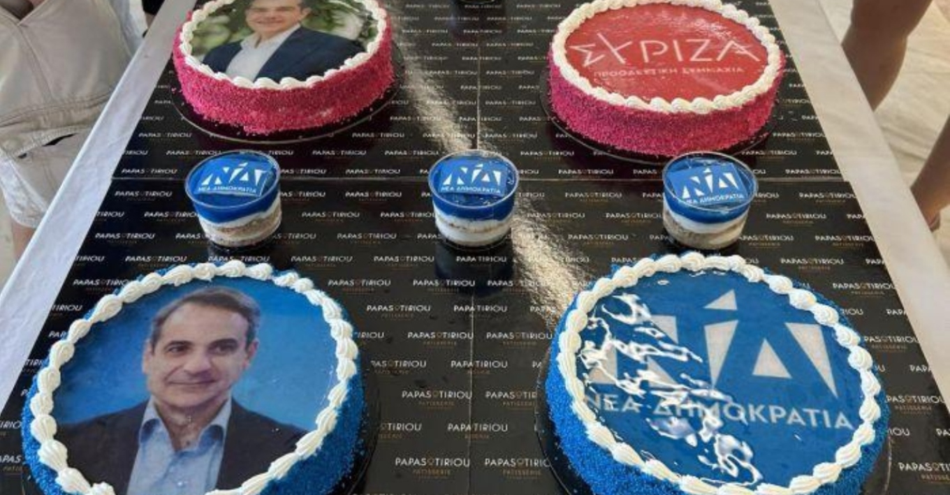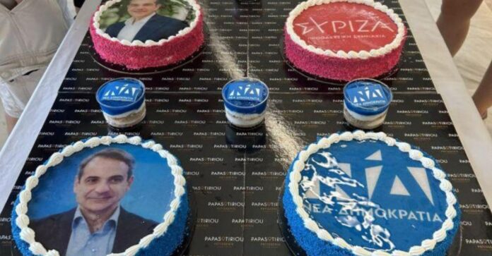 Πάνω στις τούρτες έχουν τυπωθεί τα πρόσωπα του Κυριάκου Μητσοτάκη, του Αλέξη Τσίπρα, του Νίκου Ανδρουλάκη, του Δημήτρη Κουτσούμπα και του Κυριάκου Βελόπουλου, αλλά και τα λογότυπα των κομμάτων που εκπροσωπούν.