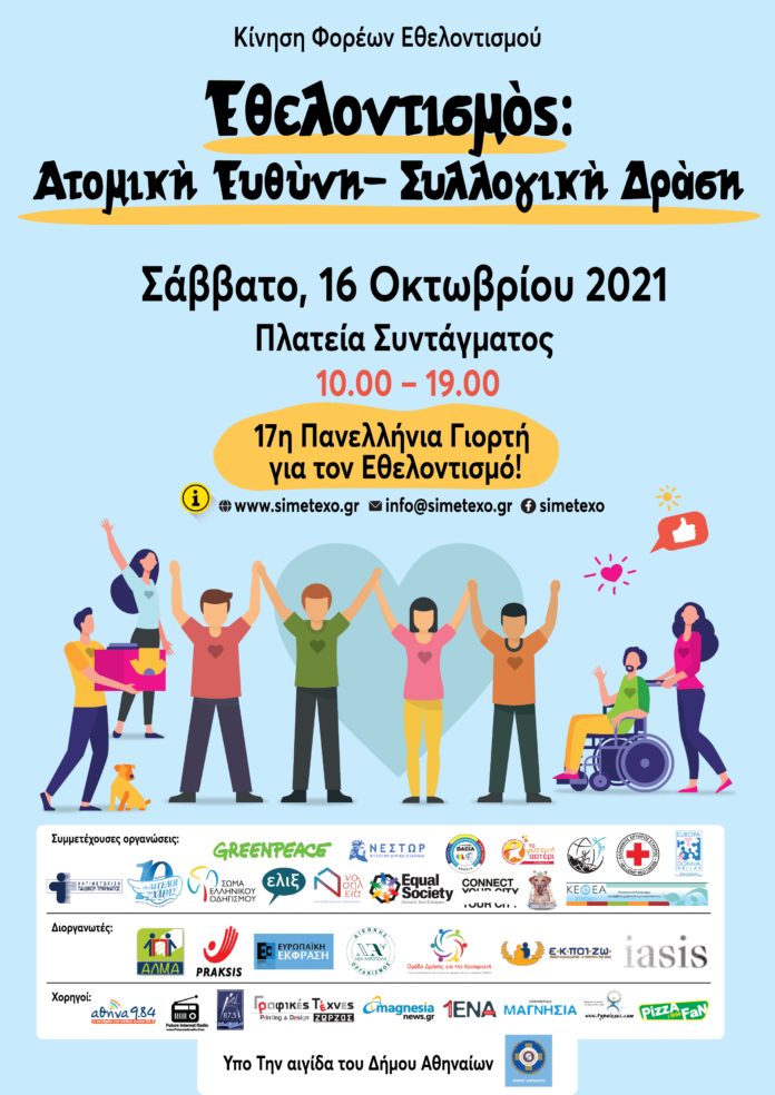 Το Σάββατο, 16 Οκτωβρίου, στην Πλατεία Συντάγματος, θα πραγματοποιηθεί η 17η Πανελλήνια Γιορτή για τον Εθελοντισμό από τις 10 το πρωί μέχρι και τις 7 το απόγευμα. Οι 30 περίπου εθελοντικοί οργανισμοί με τους εκατοντάδες εθελοντές τους προσκαλούν τον κόσμο να συμμετάσχουν σε μια ανοιχτή γιορτή για τον Εθελοντισμό και την ανιδιοτελή προσφορά στην κοινωνία και τον άνθρωπο, σύμφωνα με ανακοίνωση. Με σύνθημα ‘‘Ατομική Ευθύνη-Συλλογική Δράση’’ , αναφέρεται ότι η Γιορτή Εθελοντισμού είναι ανοιχτή σε όλους και οι επισκέπτες θα έχουν την ευκαιρία να γνωρίσουν, μέσα από την ανοιχτή έκθεση, το έργο των εθελοντικών οργανισμών και να μιλήσουν με τους εθελοντές σε μια ιδανική ευκαιρία για να μάθουν για τον εθελοντισμό στην πράξη.
