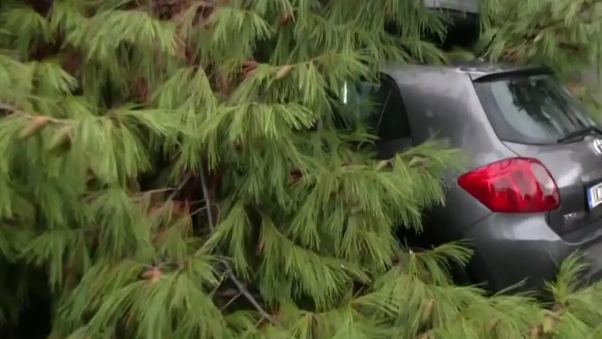 Το πεύκο που έπεσε στο Παλαιό Φάληρο καταπλάκωσε ένα παρκαρισμένο αυτοκίνητο προκαλώντας του μεγάλες ζημιές ενώ τμήμα του κάλυψε και ένα ακόμα σταθμευμένο ΙΧ.