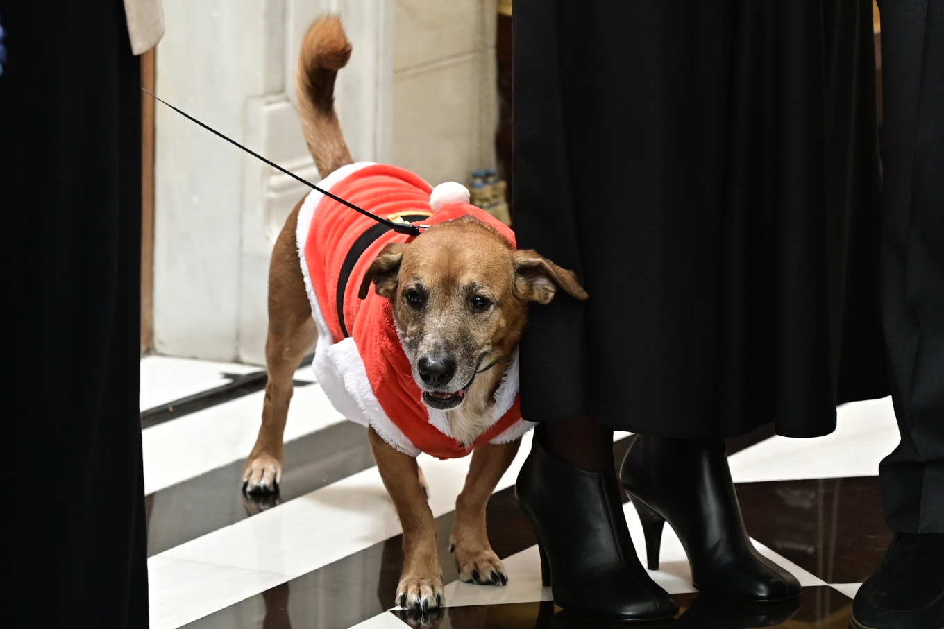 Τις εντυπώσεις έκλεψε για ακόμη μία φορά και ο Πίνατ, ο σκυλάκος του πρωθυπουργού, ο οποίος υποδέχθηκε τους καλεσμένους ντυμένος Αϊ Βασίλης.