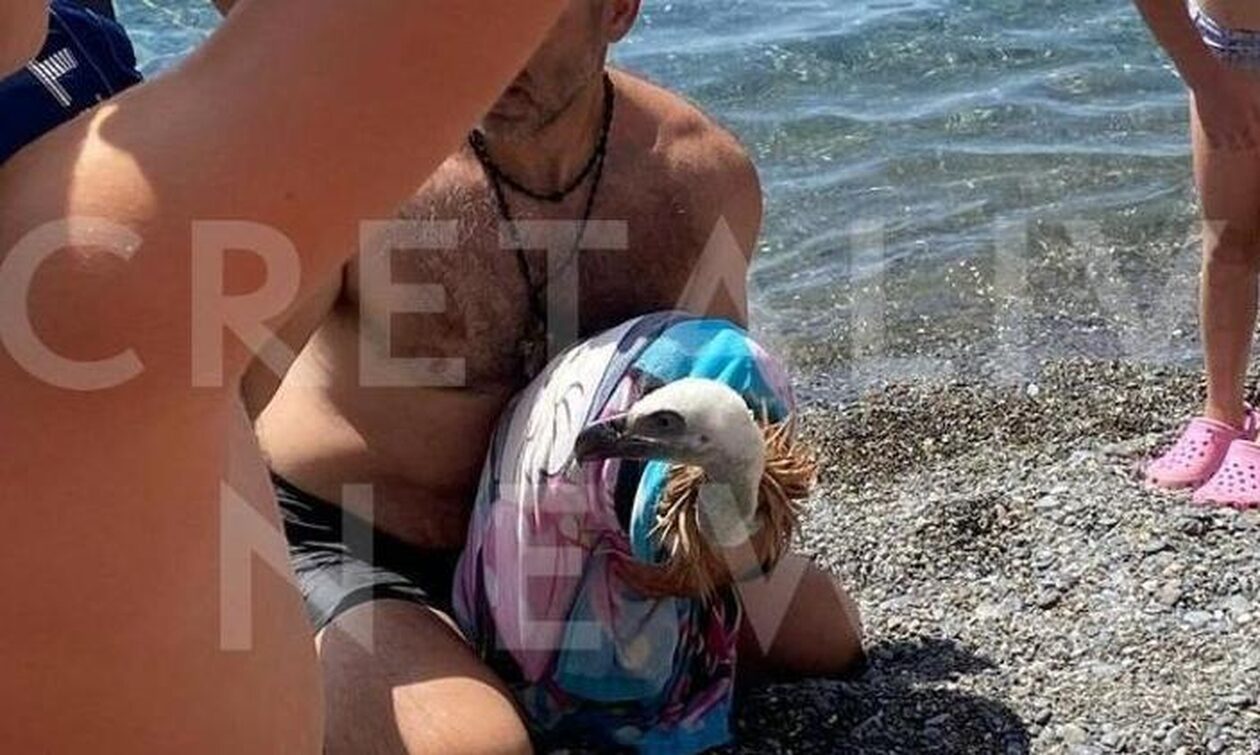 Σύμφωνα με όσα είπαν στο Cretalive άτομα που βρέθηκαν στο σημείο, το όρνιο εντοπίστηκε στο νερό. Ο κόσμος το παρακολουθούσε από το Σάββατο και διαπίστωνε κανείς ότι δυσκολευόταν, την Κυριακή κάποιοι πήγαν στο ίδιο μέρος για να τον βρουν. Τον είδαν μέσα στη θάλασσα και έσπευσαν να τον βοηθήσουν.