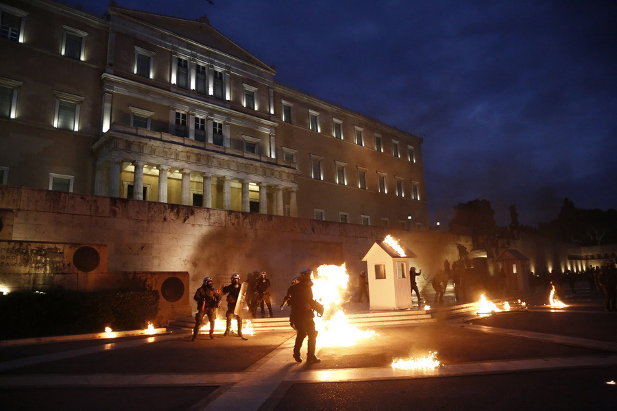 Επεισόδια βρίσκονται σε εξέλιξη μπροστά στη Βουλή όταν ομάδα κουκουλοφόρων εισήλθε στην συγκέντρωση διαμαρτυρίας και προσπάθησε να εισέλθει στο προαύλιο της Βουλής, πετώντας πέτρες και βόμβες μολότωφ. Οι αστυνομικές δυνάμεις τους απώθησαν κάνοντας χρήση χημικών.