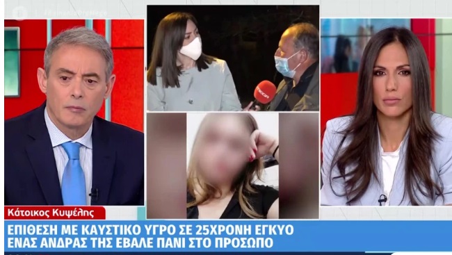 Αμέσως μετά βγήκε ένας άγνωστος που την ακινητοποίησε και στη συνέχεια της προκάλεσε εγκαύματα στο πρόσωπο με καυστικό υγρό, με το οποίο είχε εμποτίσει ένα πανί. Στη συνέχεια, σύμφωνα πάντα με την καταγγελία, ο άνδρας επιβιβάστηκε στο αυτοκίνητό του και εξαφανίστηκε.