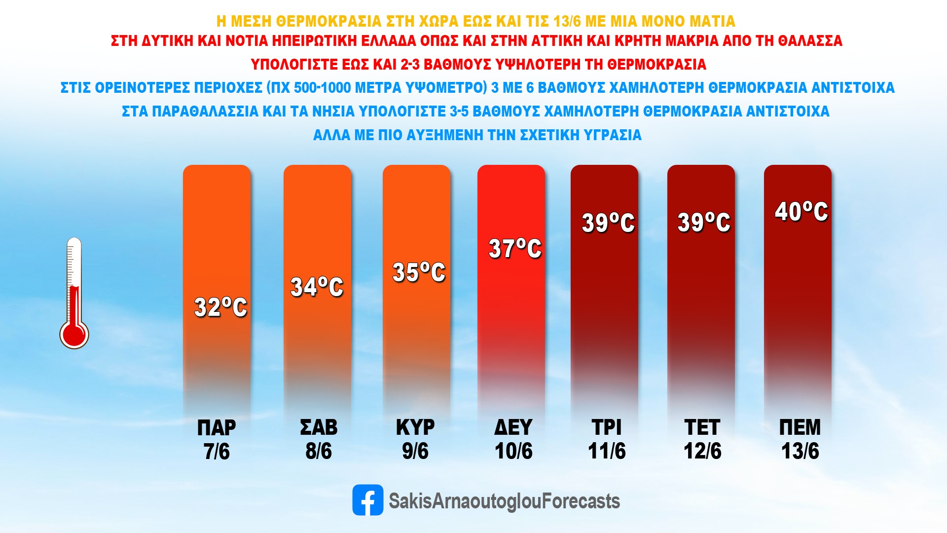 Όπως προβλέπει ο Σάκης Αρναούτογλου από τους 30-32°C της Παρασκευής, θα φτάσουμε τους 42°C την επόμενη Πέμπτη, 13 Ιουνίου. Ο μετεωρολόγος ανάρτησε στο Facebook αναλυτικά έναν πίνακα με τις μέγιστες θερμοκρασίες που αναμένονται γενικά στη χώρα την επόμενη εβδομάδα, σημειώνοντας ωστόσο πως οι κατά τόπους μέγιστες τιμές, θα πρέπει να υπολογίζονται ως μεγαλύτερες κατά μία με δύο μονάδες.