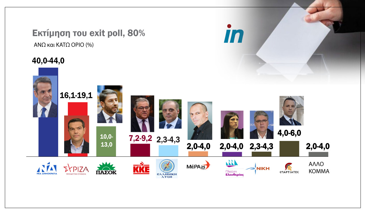 Αυτό που αποτυπώνεται στο κοινό exit poll είναι ότι η ΝΔ του Κυριάκου Μητσοτάκη καταγράφει ισχυρή αυτοδυναμία, ο ΣΥΡΙΖΑ σημειώνει απώλειες, το ΠΑΣΟΚ καταγράφει μικρή άνοδο, ενώ το μεγάλο σοκ των εκλογών είναι οι Σπαρτιάτες, κόμμα το οποίο έχει στηρίξει ανοιχτά ο καταδικασμένος για συμμετοχή σε εγκληματική οργάνωση, Ηλίας Κασιδιάρης. Επίσης, σύμφωνα με το exit poll υπάρχει ένα θρίλερ στα μικρά κόμματα με τη ΝΙΚΗ, την Πλεύση Ελευθερίας και το ΜέΡΑ25 να δίνουν μάχη για να μπουν στη Βουλή. Όπως τονίζουν και οι δημοσκόποι για κάποια κόμματα θα πρέπει να περιμένουμε τα πραγματικά αποτελέσματα.