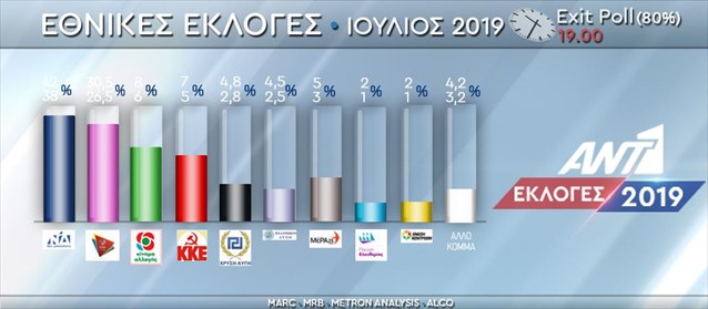 Νίκη της Ν.Δ. με ευρεία διαφορά έναντι του ΣΥΡΙΖΑ δίνει το κοινό exit poll για τις βουλευτικές εκλογές, που μεταδόθηκε από τους τηλεοπτικούς σταθμούς με το κλείσιμο της κάλπης. Τρίτο κόμμα βγαίνει το Κίνημα Αλλαγής. Ποιοι δίνουν τη μάχη να μπουν στη Βουλή.