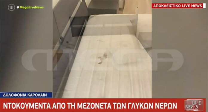 Τα σεντόνια και οι μαξιλαροθήκες έχουν αφαιρεθεί για εξέταση γενετικού υλικού και άλλων αποτυπωμάτων. Η κηλίδα όμως από αίμα της Καρολάιν στο σημείο όπου ήταν το κεφάλι της, εκεί όπου προκλήθηκε ο ασφυκτικός της θάνατος, έχει περάσει στο στρώμα κι έχει αφήσει το σημάδι της φρίκης που έζησε τις τελευταίες της στιγμές.