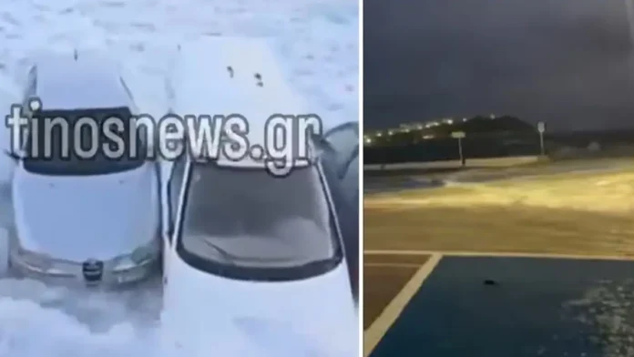 Σοβαρά προβλήματα προκάλεσε η έντονη κακοκαιρία και στην Τήνο το Σάββατο (10.01.2026). Ισχυρά κύματα εισέβαλαν στον χώρο στάθμευσης του λιμανιού και παρέσυραν σταθμευμένα αυτοκίνητα.