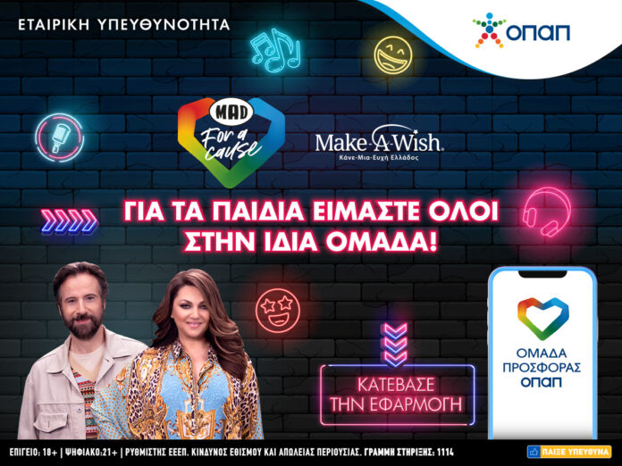 Ο ΟΠΑΠ υλοποιεί την πρωτοβουλία προσφοράς και αγάπης “MAD for a Cause”, με την υποστήριξη του MAD, για να κάνει πραγματικότητα τις ευχές τεσσάρων παιδιών του Make-A-Wish (Κάνε-Μια-Ευχή Ελλάδος). Στην εκπλήρωση των παιδικών ευχών μπορούν να συμμετάσχουν όλοι δωρεάν, μέσω της «Ομάδας Προσφοράς ΟΠΑΠ», διεκδικώντας παράλληλα δύο δώρα εμπειρίας από την Καίτη Γαρμπή και τον Κωστή Μαραβέγια.