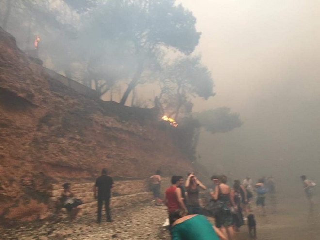 Συγκλονίζουν τα καρέ από την παραλία Αργυρή Ακτή στη Νέα Μάκρη. Δεκάδες πολίτες έπεσαν κυριολεκτικά στη θάλασσα για να σωθούν από τη φωτιά που έφτασε μέσα στην παραλία.