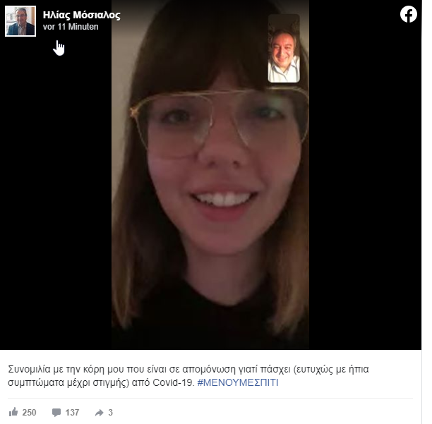 «Συνομιλία με την κόρη μου που είναι σε απομόνωση γιατί πάσχει (ευτυχώς με ήπια συμπτώματα μέχρι στιγμής) από Covid-19. #ΜΕΝΟΥΜΕΣΠΙΤΙ» έγραψε ο κ. Μόσιαλος.