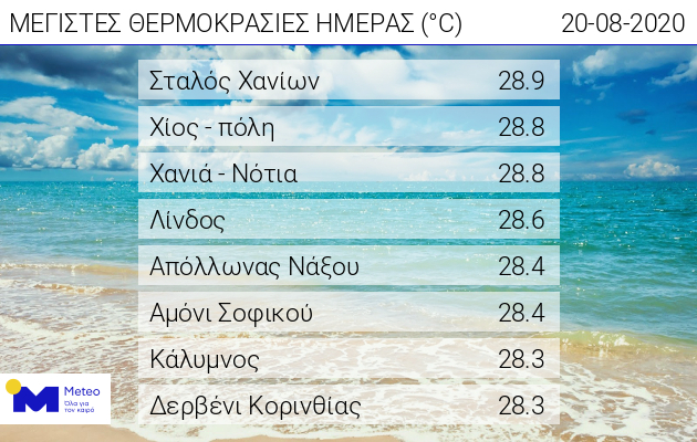 Θερμοκρασία: Από 20 έως 34 βαθμούς Κελσίου. Στην Ήπειρο η ελάχιστη 3 με 4 βαθμούς χαμηλότερη.