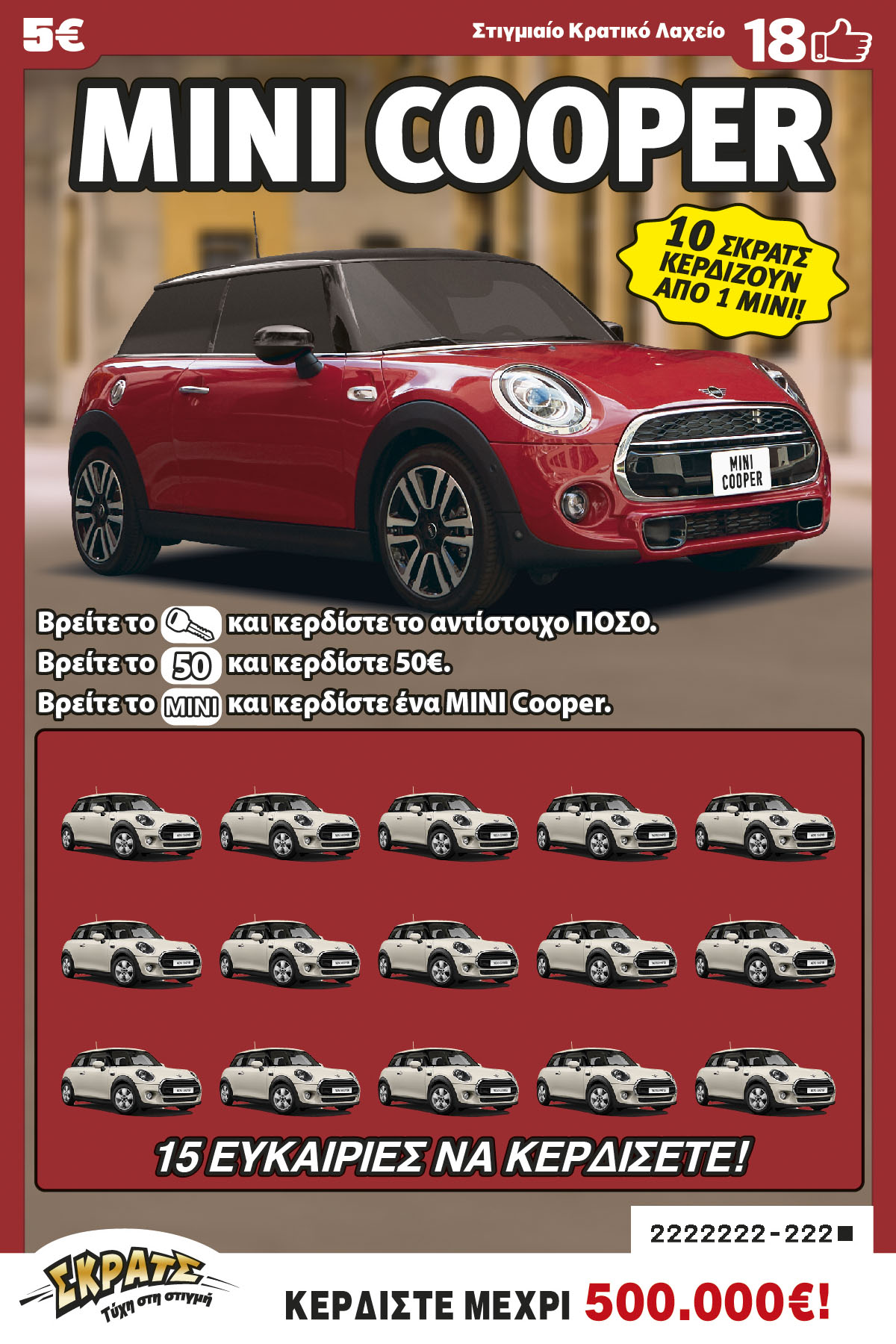 Tο νέο παιχνίδι «MINI COOPER» από το ΣΚΡΑΤΣ μοιράζει στους τυχερούς παίκτες όχι μόνο χρηματικά έπαθλα, αλλά και αυτοκίνητα. Συγκεκριμένα, το παιχνίδι προσφέρει κέρδη έως και 500.000 ευρώ, ενώ δέκα λαχνοί κερδίζουν από ένα αυτοκίνητο Mini Cooper.