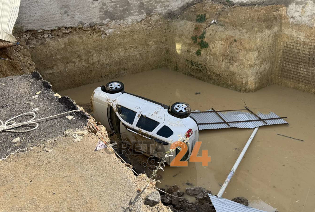 Το περιστατικό σημειώθηκε στο κέντρο του Ηρακλείου, όταν το οδόστρωμα υποχώρησε, με αποτέλεσμα το σταθμευμένο όχημα να καρφωθεί αρχικά μέσα στην λακκούβα που δημιουργήθηκε.
