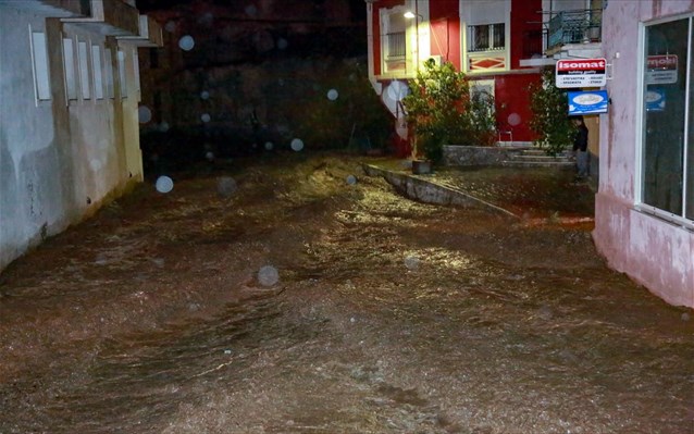 Σε ποτάμι επίσης μετατράπηκε και ο κεντρικός δρόμος στην Αγία Παρασκευή, αλλά και δρόμοι στο Πλωμάρι, ενώ λάσπη και πέτρες κατέβασε το νερό στην Πλαγιά όπου πλημύρισαν σπίτια και μαγαζιά.