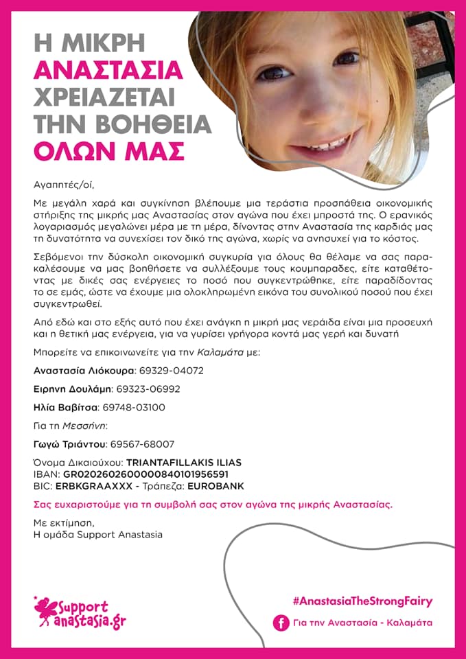 «Ξεκινήσαμε τις θεραπείες από την προηγούμενη Πέμπτη. Προσπαθεί να προσαρμοστεί το σώμα της στις θεραπείες. Είναι νωρίς ακόμα. Εδώ μας έδωσαν ένα 35% επιτυχία. Ακούγεται λίγο, αλλά μπροστά στο 0% που μας έδωσαν στην Ελλάδα, είναι πολύ μεγαλύτερο. Θα χρειαστούμε 3-4 εβδομάδες για να δούμε πώς ανταπεξέρχεται ο όγκος στη θεραπεία. Θα κάνουμε μαγνητικές. Θα είναι δύσκολες εβδομάδες που χρειάζονται γερό στομάχι» τόνισε η μητέρα της μικρής Αναστασίας.«Λίγοι επιβίωσαν από την πάθηση αυτή ανά τον κόσμο. Ένα μεγάλο ποσοστό αυτών έκανε την θεραπεία που επιλέξαμε» ανέφερε για το διάχυτο γλοίωμα, που πρόκειται για μια επιθετική μορφή καρκίνου, στο κεντρικό νευρικό σύστημα του εγκεφάλου.
