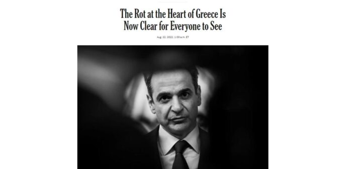 «Τον Μάιο, καθώς οι βίδες του κατασκοπευτικού σκανδάλου είχαν αρχίσει να γυρίζουν, ο κ. Μητσοτάκης βρέθηκε στην Ουάσιγκτον για να εκφωνήσει μια ομιλία στο Κογκρέσο σχετικά με τη σημασία της διατήρησης των δημοκρατικών αξιών και της καταπολέμησης της αυταρχικής υπερβολής. Για 40 λεπτά τόνισε την αναγκαιότητα της κοινωνικής εμπιστοσύνης και των ισχυρών θεσμών. “Οι αρχαίοι Έλληνες”, είπε ανάμεσα σε χειροκροτήματα, “θεωρούσαν την αλαζονεία, τον εξτρεμισμό και την υπερβολή τις χειρότερες απειλές για τη δημοκρατία”. Το ερώτημα για τον κ. Μητσοτάκη είναι: Γιατί δεν νιώθει το ίδιο;”.
