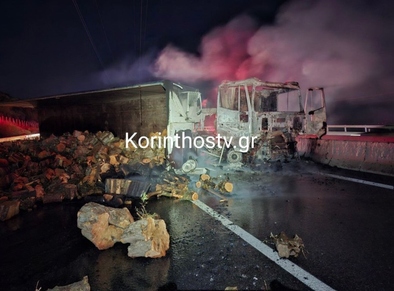 Από τη σφοδρή σύγκρουση ξέσπασε φωτιά στο φορτηγό, σύμφωνα με το korinthostv.gr. Οχήματα της Πυροσβεστικής έσπευσαν άμεσα στο σημείο για την κατάσβεση της πυρκαγιάς, ωστόσο η νταλίκα καταστράφηκε ολοσχερώς.