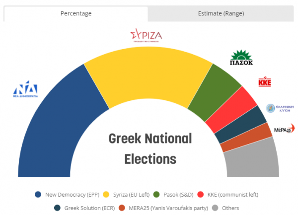 Σύμφωνα με την εν λόγω εκτίμηση, το ποσοστό της ΝΔ κυμαίνεται στο 33-34%, του ΣΥΡΙΖΑ στο 32,5% – 33,5%, του ΠΑΣΟΚ στο 8,7-9,3%, του ΚΚΕ στο 5,7 – 6,3%, της Ελληνικής Λύσης στο 4,5 – 5,1% και του ΜέΡΑ25 στο 3,5 – 4,1%.