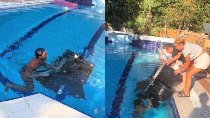 Στον πάτο της πισίνας κατέληξε το μπάρμπεκιου του Λευτέρη Πανταζή, λόγω του δυνατού ανέμου που επικρατεί σήμερα.