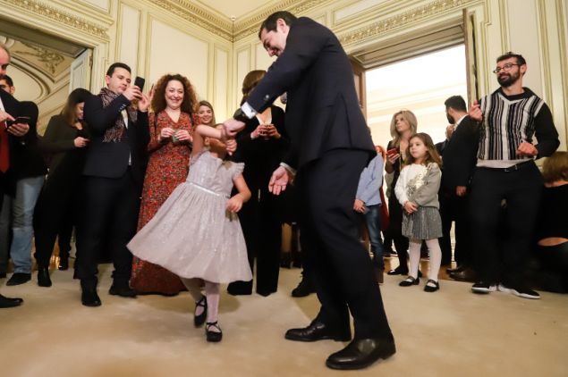 Με το που ξεκίνησε ο χορός τα φλάς άναψαν. Στην μέση της αίθουσας δεξιώσεων του Μεγάρου Μαξίμου, ο πρωθυπουργός να ξεκινάει τον χορό, δεν είναι συνηθισμένο θέαμα.