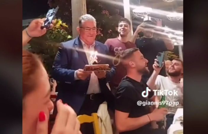 Όλοι στην παρέα γέλασαν με το σκηνικό, ενώ ο 26χρονος που είχε τα γενέθλια έμεινε… παγωτό, βλέποντας τον Δημήτρη Κουτσούμπα να αφήνει περιχαρής την τούρτα στο τραπέζι, να χαιρετά το νεαρό και να του εύχεται.