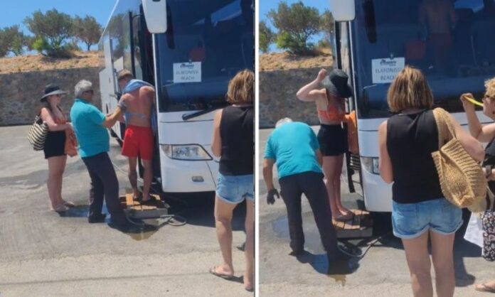 Συγκεκριμένα, όπως δείχνει το βίντεο που ανέβασε ένας τουρίστας στο Tik Tok, οι τουρίστες που ήθελαν να ταξιδέψουν από το Ελαφονήσι στα Χανιά, πριν επιβιβαστούν στο εν λόγω λεωφορείο, στέκονταν ένας-ένας προσοχή λίγο πριν διαβούν την πόρτα κι εκεί ο οδηγός αφού πρώτα τους πλένει με το λάστιχο, στη συνέχεια τους ρίχνει αέρα για να φύγει από πάνω τους η άμμος!