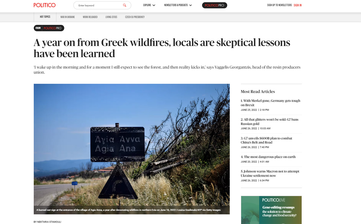 Θυμό και οργή για το περσινό πύρινο θρίλερ, αλλά και για την κυβερνητική αδιαφορία έναν χρόνο μετά, «συνάντησε» το Politico στο οδοιπορικό που έκανε στην πυρόπληκτη Εύβοια.