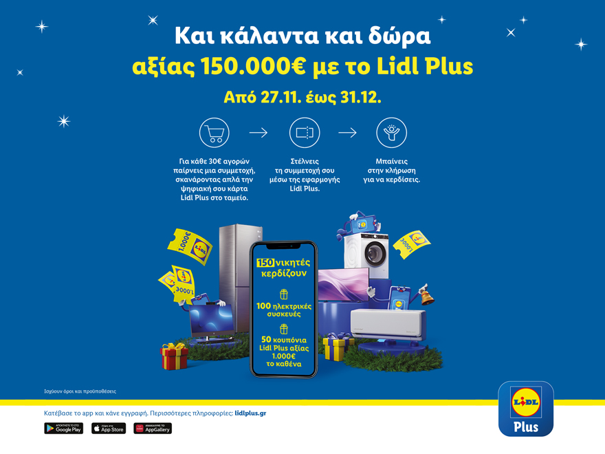 Τα Χριστούγεννα έρχονται μαζί με τους κουραμπιέδες, τα μελομακάρονα, τις δίπλες, τα φωτάκια… Το καλύτερο όμως, είναι ότι έρχονται και με σούπερ διαγωνισμό από το Lidl Plus που χαρίζει σε 150 τυχερούς χρήστες της εφαρμογής 100 ηλεκτρικές συσκευές και 50 κουπόνια Lidl Plus αξίας 1.000€ το καθένα.