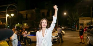Με συνθήματα έγινε δεκτή από τους συγκεντρωμένους έξω από τα γραφεία του ΣΥΡΙΖΑ, η Έφη Αχτσιόγλου.
